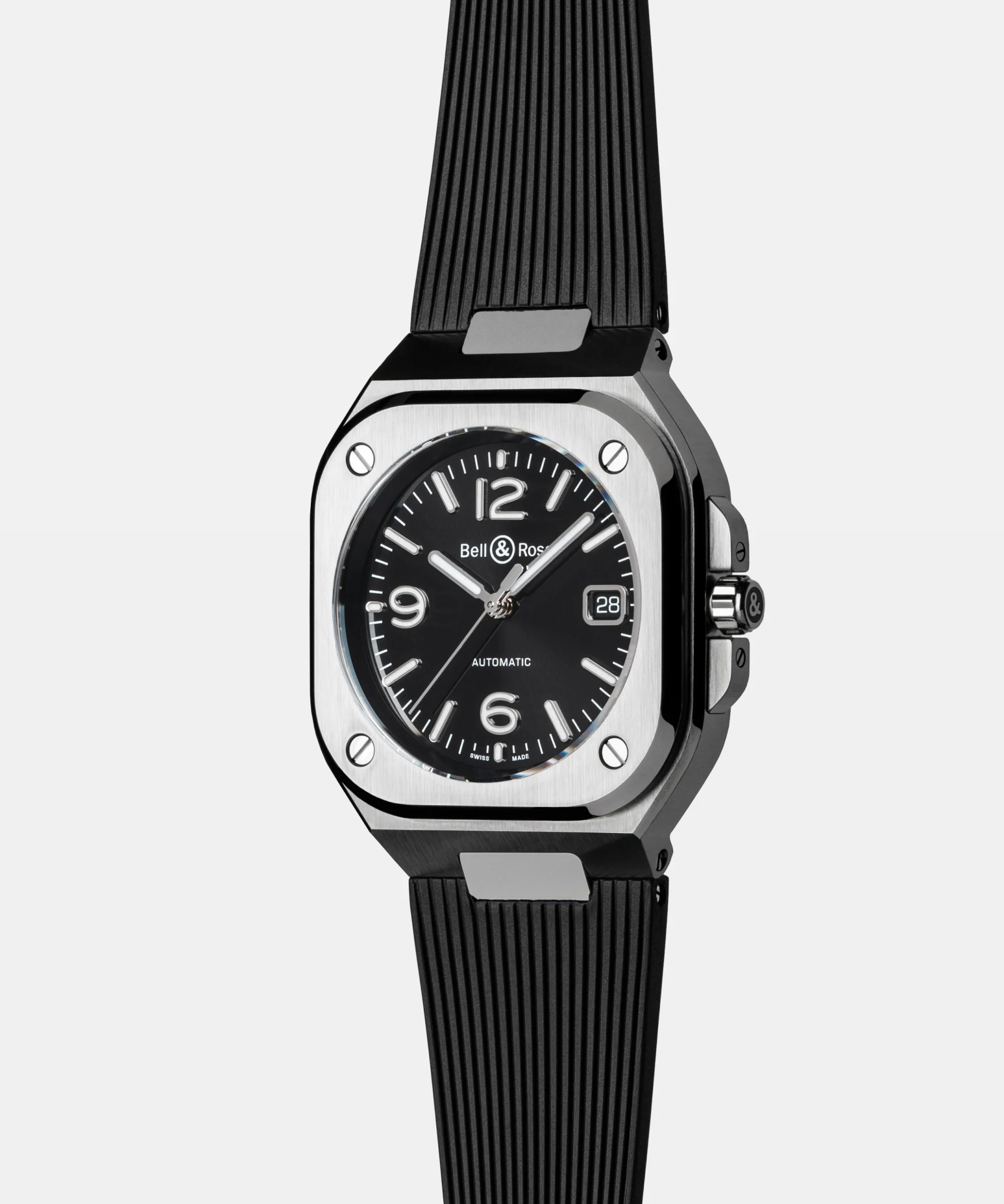 La BR-05 appartient à la famille des montres au bracelet intégré : le bracelet fusionne avec le boîtier en un tout cohérent.